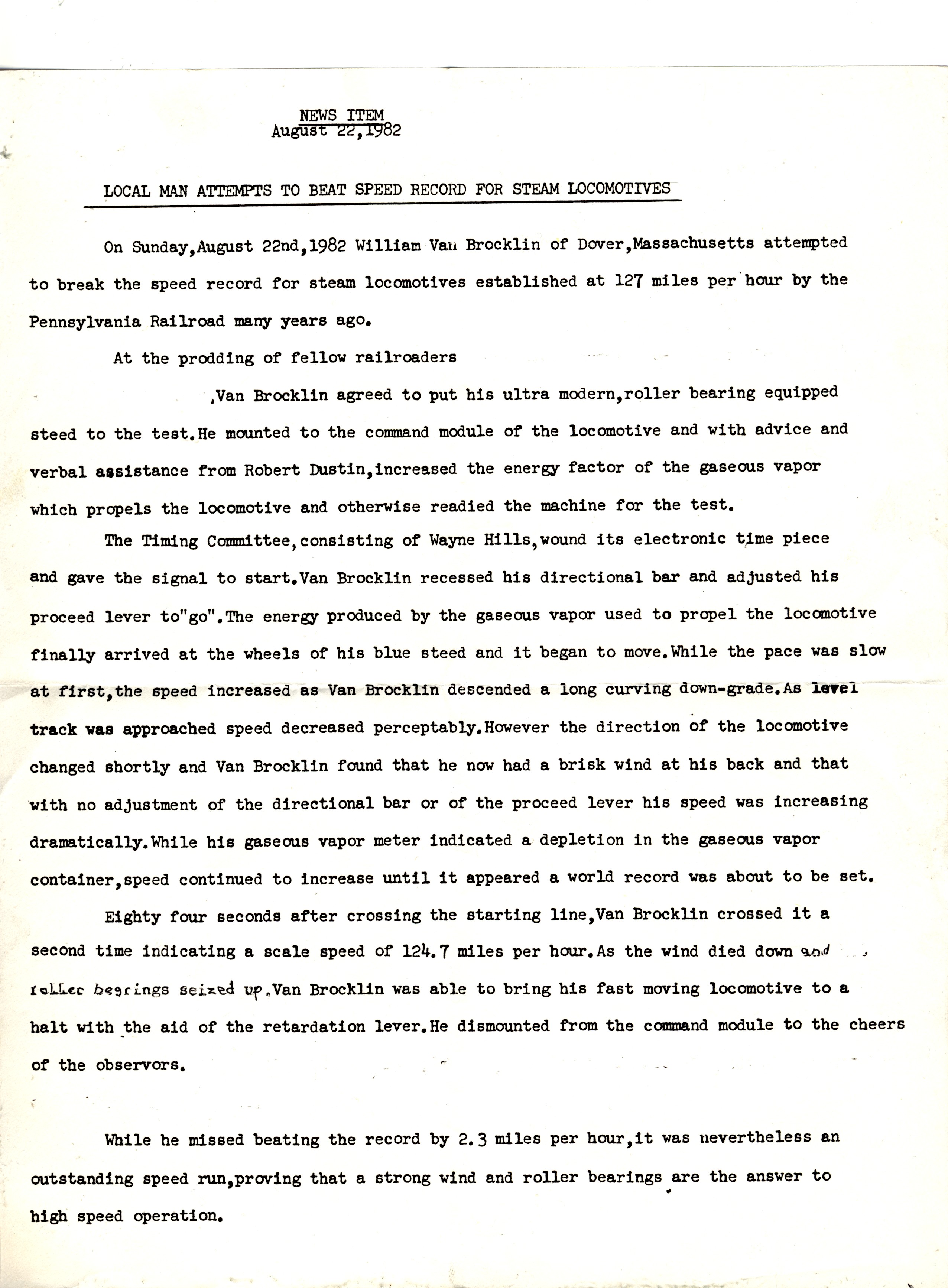 Bill Van Brocklin steam locomotive speed trial at Norfolk Street Track of Waushakum Live Steamers, Hollister, MA.