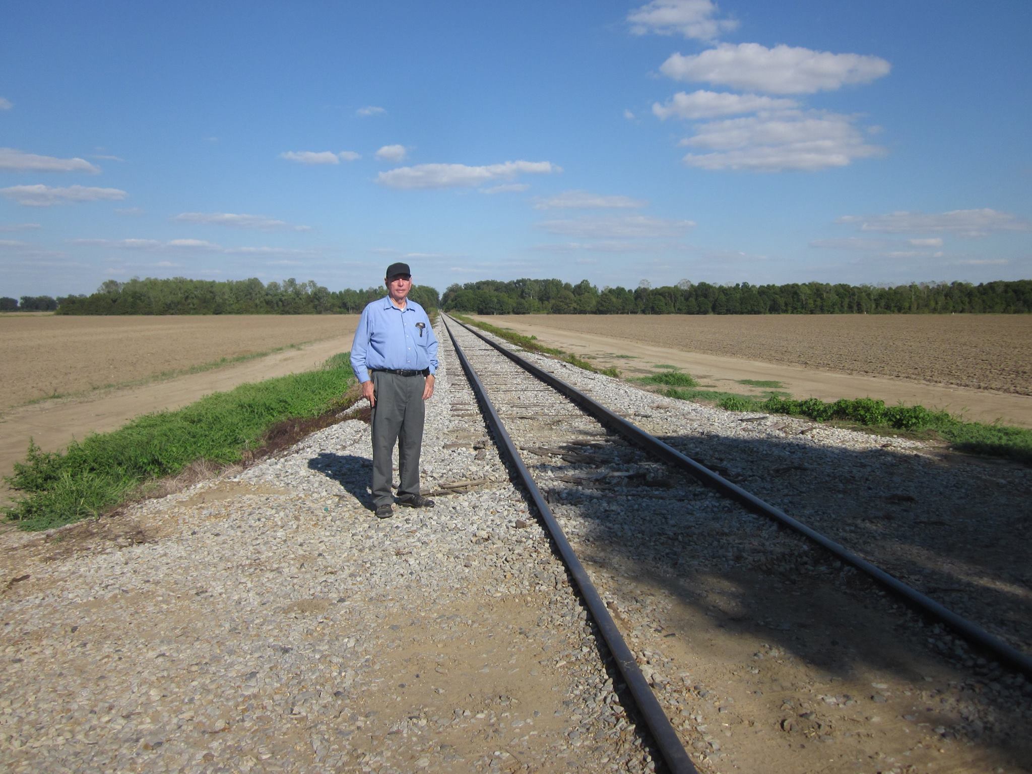 Bob Gray on the old Columbus & Greenville Railroad, from which he retired about 1973 after surviving a train wreck. He served as a consultant on the movie, "Oh Brother, Where Art Thou", which was released in 2000. Here is Bob standing alongside the track where the train scene was filmed at the beginning of the movie. Bob had actually been in the cab of the steam locomotive while the scene was shot. He has a photo of himself taken with George Clooney. Photo by Terry Shirley.