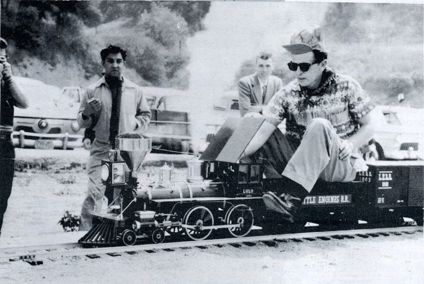 Bob Harpur on the Little Engines demonstrator train at the Los Angeles Live Steamers Golden Spike ceremony, 5 May 1957. From The North American Live Steamer, Volume 1 Number 12.