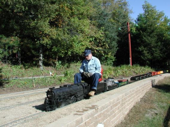 Bruce Saylor on his 1 inch Berkshire arriving at the St. Croix station. Photo by Phil. Paskos at St.Croix R.R. Sept 2001, from DiscoverLiveSteam.com,