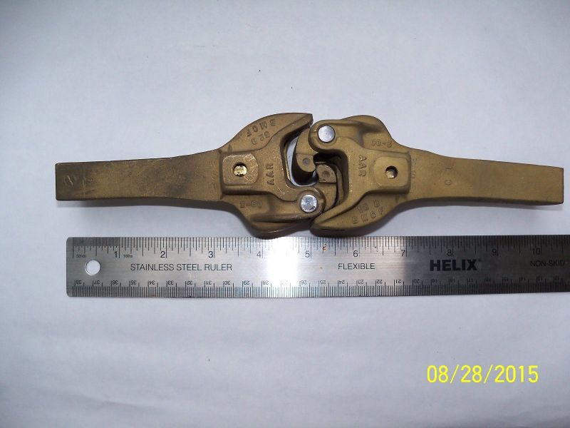 A pair of couplers by Buckeye Model Car and Foundry, cast in mag-bronze. August 2015.