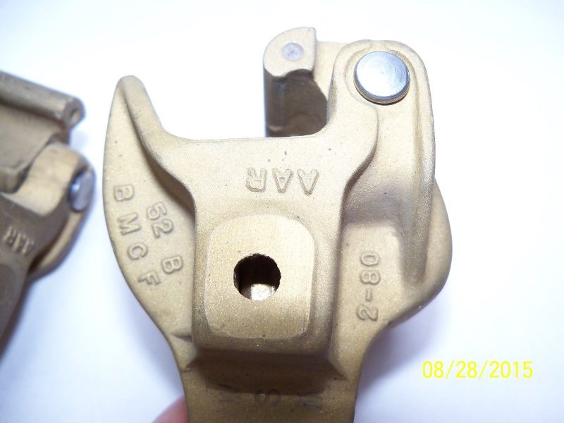A pair of couplers by Buckeye Model Car and Foundry, cast in mag-bronze. August 2015.