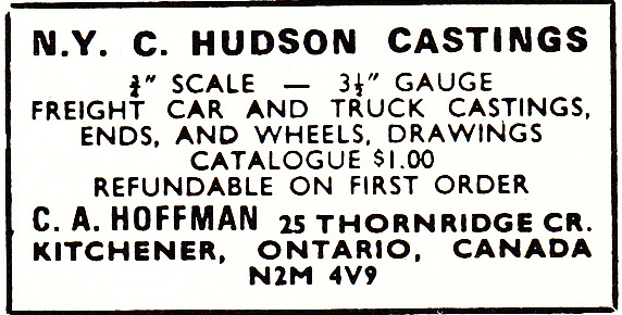 Advertisement for C.A. Hoffman, offering 3/4 inch scale NYC Hudson Castings, from Live Steam Magazine, July 1975.
