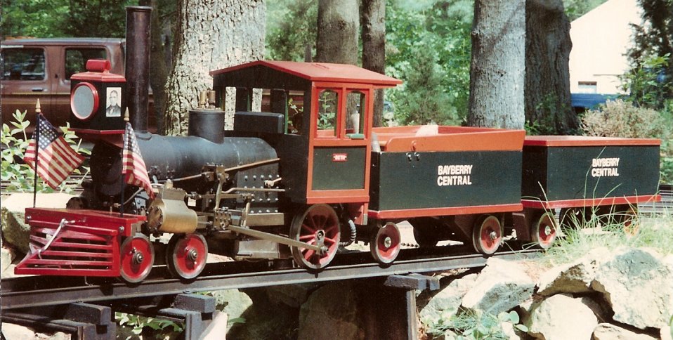 At his father's track in Boxford, this is Charlie Purinton's 4-2-0 freelance in 7-1/4 inch gauge. Its name is Seth. May 28, 1989. Photo by Bob Hornsby. From http://www.northeastlivesteamers.org/Docs/History/NELSmem_boxford_3.html