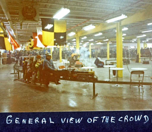 Chet Brown and his 3/4" scale Hoffman (NYC) Hudson pulling a group of children indoors at the Harbourfront Railway Show - 1979. From http://pics.tsme.ca/viewarchive.aspx
