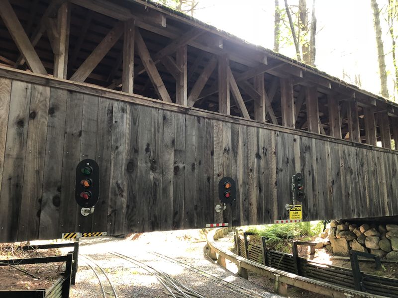 Covered bridge where high-line crosses over 7.25 gauge track at Waushakum Live Steamers in Holliston, MA. Photo by Daris A Nevil, August 2018.