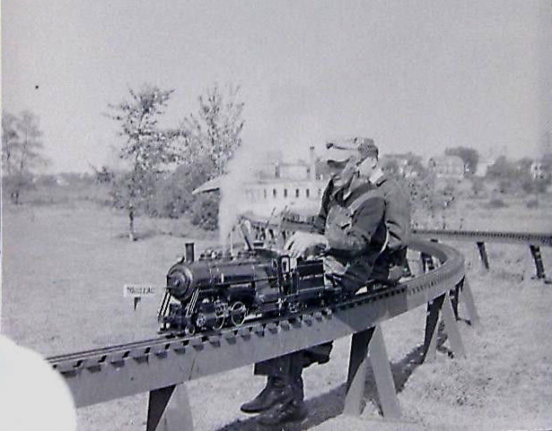 Art Wegner running Gene Stevens' 3-1/2 inch gauge 4-4-2T at NELS Danvers, MA, October 1939. Photo from eBay, 2018.