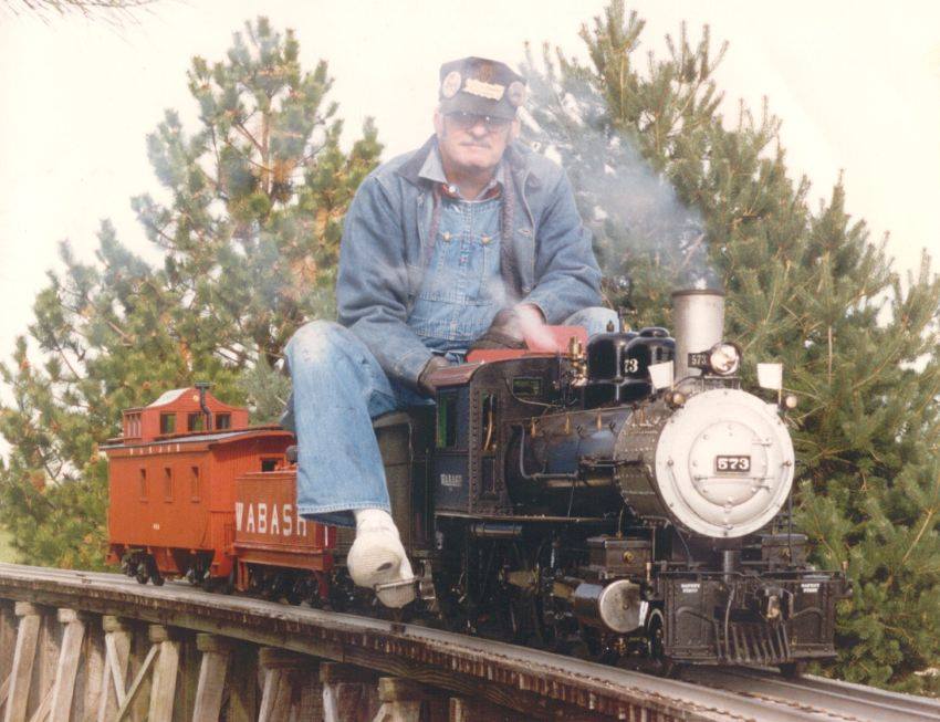 Dave Gibson and his Harpur 573 shown here on Gail Gish's Rio Grande Scenic Railroad. The red Wabash auxiliary water car came about after a low water incident at Tlaquepaque, on the Comanche & Indian Gap Railroad, back before the water line when the tank was hand filled. Photo by Dallas Giddens.