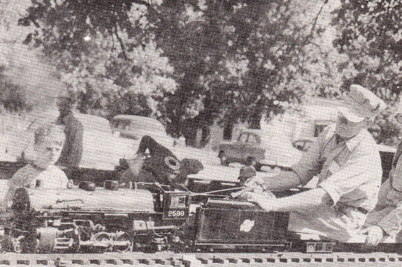 Dave Mackie of Ashland, Wisconsin running his Mikado, with Larry Edwards, of Green Bay, Wisconsin as a passenger, at the Winnipeg Meet in September 1955. The 2599 is scaled 3/4 inch to 1 foot. Not a casting is used in the entire engine. Everything is either fabricated or cut from solid. It has Young valve gear. From The North American Live Steamer, Volume 1, Number 9, 1956.