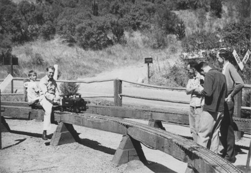 Composer and live steam collector, David Rose, behind a newly purchased British ¾” tanky. The Brotherhood Meet 1952, GGLS Redwood Canyon Park. From http://www.goldengatels.org/library/Photos%20and%20videos/pdf%20photo%20albums/Redwood%20Canyon%20Pictures.pdf