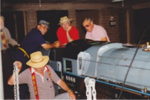 Dick Bartel, Dick Thomas, and Bill Norred discuss the backhead arrangement of the 15 inch gauge Hudson at The Goleta Valley Western Railroad. Ed Lebec is in the foreground. Photo by Rick Zobelein. From http://www.goldengatels.org/library/CallBoys/CallBoy%20October%202014%20online%20version.pdf