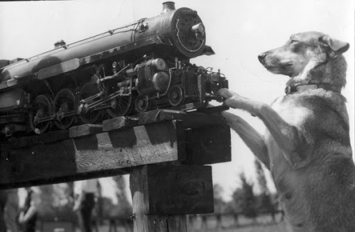 Doug Massie's locomotive with his dog Lady added for scale at Montreal track - 1950. http://pics.tsme.ca/viewarchive.aspx