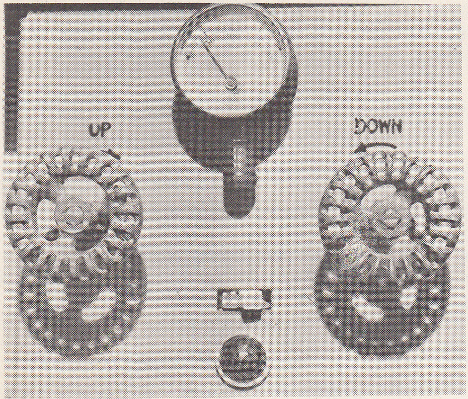 Dwight Durkee's Hydraulic Engine Lift, Figure 2. Simple contact switch operated by left hand-wheel starts motor. The right is the release valve. Toggle switch shuts off power to panel indicated by pilot light. From "The North American Live Steamer", Volume 1 Number 4.
