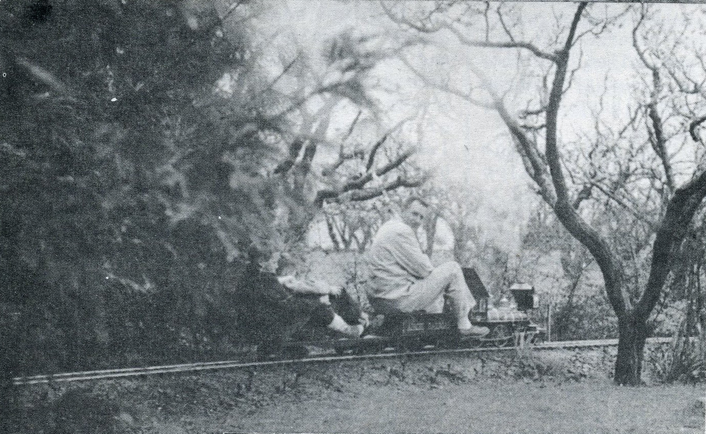 Dwight Durkee driving Ralph Sweely on engine. From The North American Live Steamer, Volume 1 Number 10.