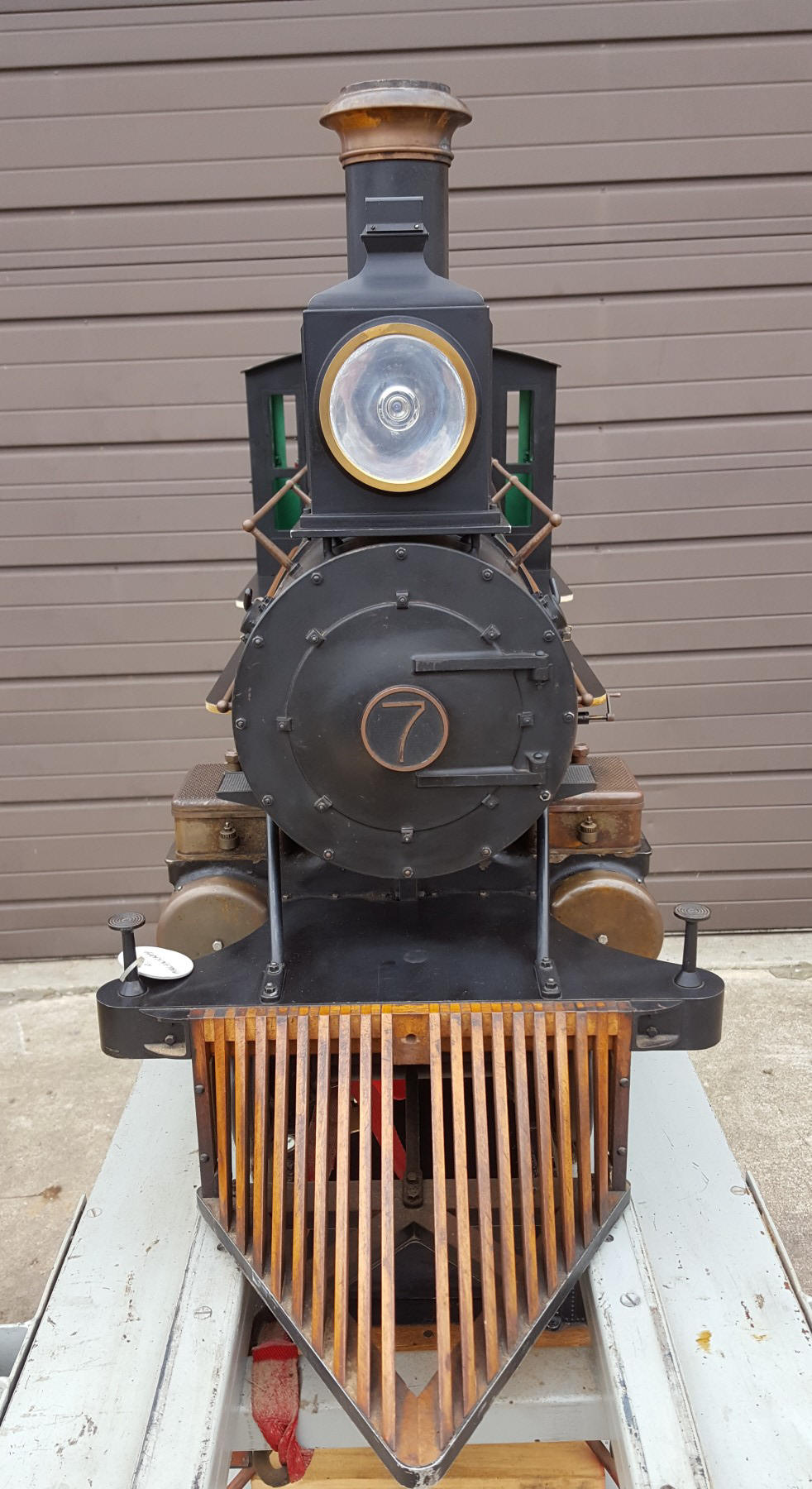 7.5 gauge 1.5 scale model of the 1897 Baldwin 4-4-0 American class Number 7 locomotive displayed at the Henry Ford museum. Scratch built by Master machinist and pattern maker Emery Ohlenkamp and completed in 1984. From http://discoverlivesteam.com/discoverforsale/forsale/7_Ohlenkamp/index.htm