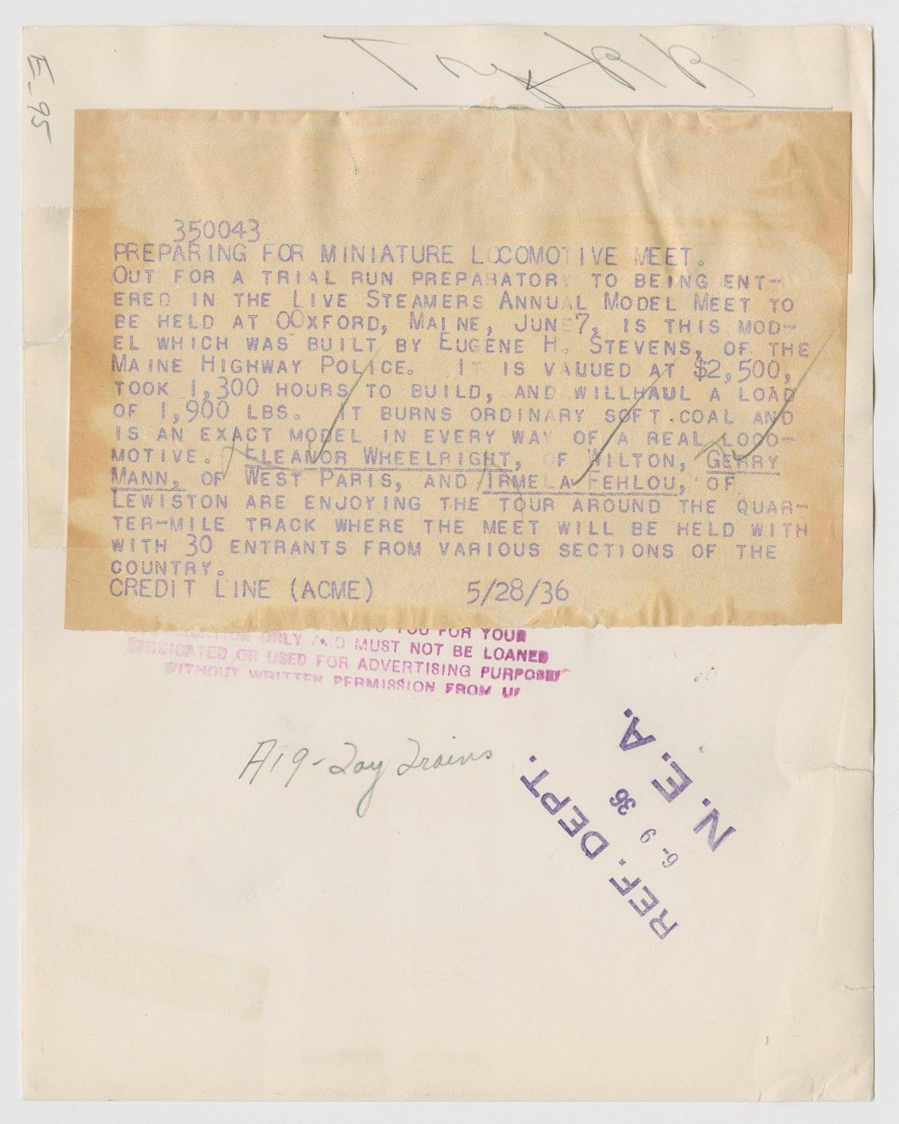 current12:00, 18 June 2018Thumbnail for version as of 12:00, 18 June 20181,280 × 1,600 (227 KB)Dnevil (talk | contribs)Preparing for Miniature Locomotive Meet Out for a trail run preparatory to being entered in the Live Steamers Annual Model Meet to be held at Oxford, Maine, June 7, is this model which was built by Eugene H. Stevens, of the Maine Highway Police. It is...