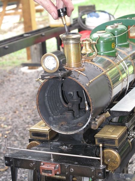 Bob Blackson shown setting the removable boiler on this 1-inch scale live steam locomotive. The loco was built by George Thomas in 1966. Photo by Bill Shields, from http://www.chaski.org/homemachinist/viewtopic.php?f=8&t=102147&start=24