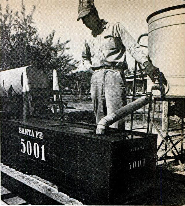Water tank, like everything on the road, is built to scale. Tender holds 40 gallons of water. Frank Mann and his Santa Fe 5001. From "Popular Mechanics", November 1970.