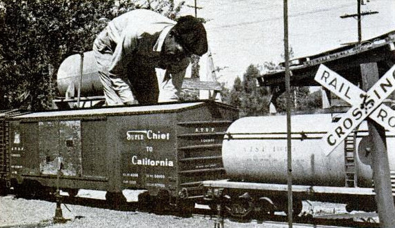 Mann gives appearance of a giant in Lilliputian land as he checks out freight car at railroad crossing. From "Ebony" magazine, December 1968