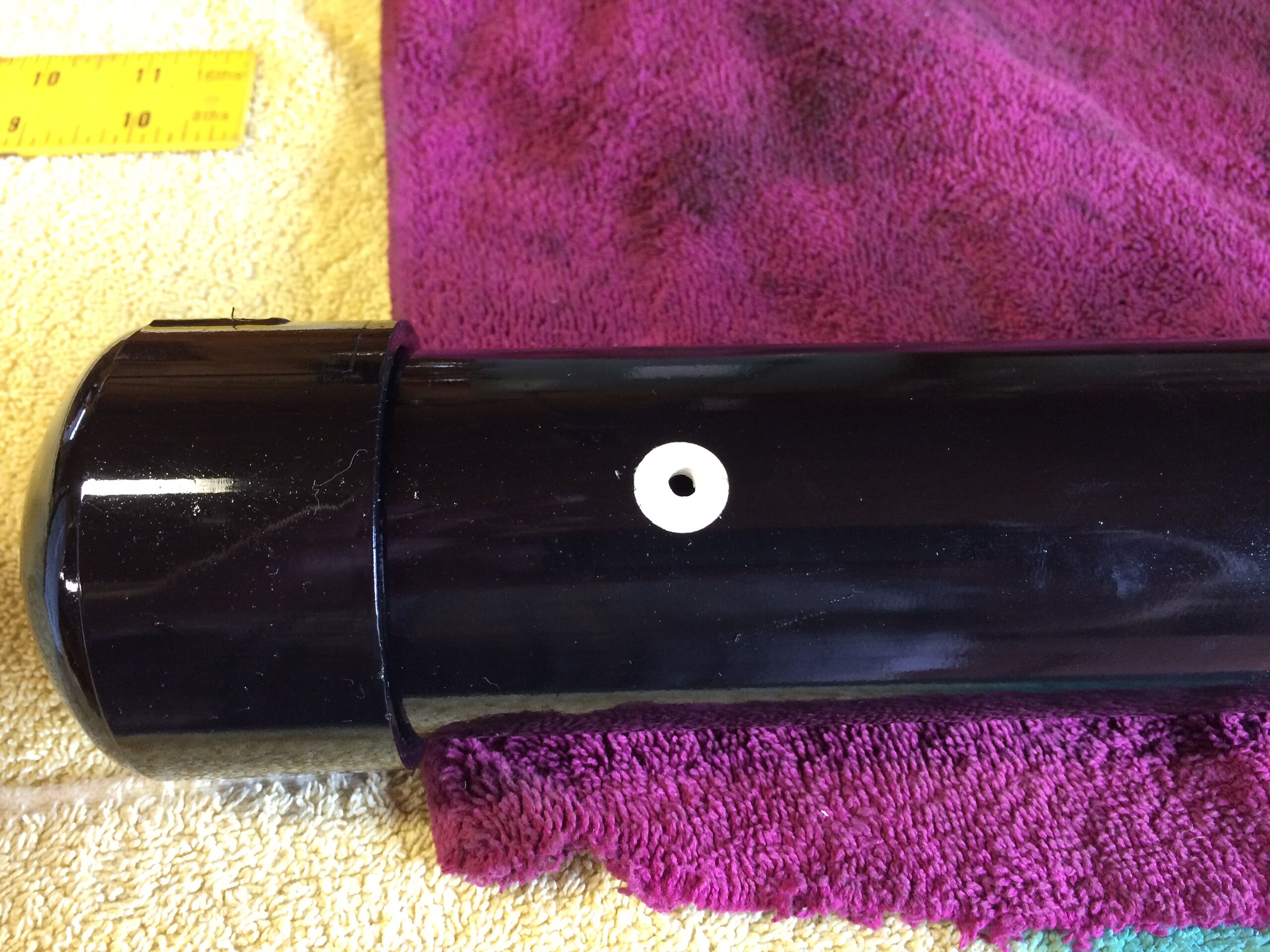 I started with the air tank. It is constructed using 2 inch diameter PVC pipe (schedule 40) with a pair of caps. A hole was drilled and tapped for 10-32 threads to accept a Clippard fitting. An adhesive dot was placed over the hole before painting. Photo by Daris A Nevil, July 2015.