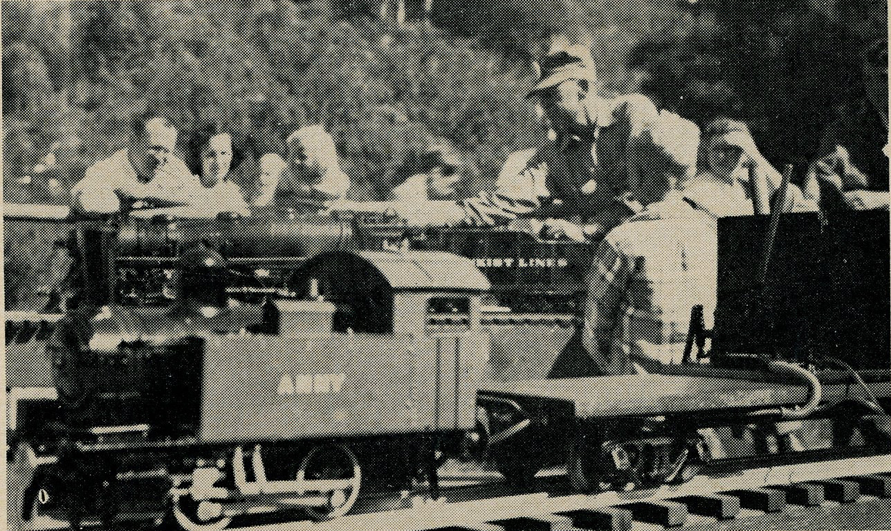 Gordon Corwin's Anny, a copy of Carl Purinton's Granny loco. Gordon is seen in background aboard his 3/4 inch 4-8-4. GGLS Labor Day Meet 1953. Photo by L.M. McKenney. From "The Miniature Locomotive", Nov-Dec 1953.