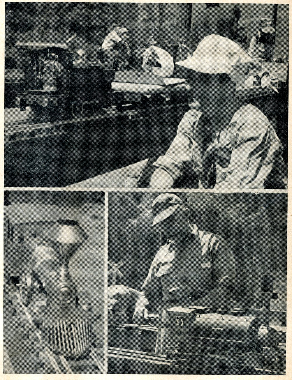 Above: Harry Cook with his 3-1/2 inch gauge "Juliet". Bottom Left: C.P. Huntington, under construction in 3/4 inch scale by Harry Dixon. Bottom Right: John Matthews firing up "Pug". Golden Gate Live Steamers Memorial Day Meet, 1952. Photos by Harry Dixon. From "The Miniature Locomotive", November-December 1952.