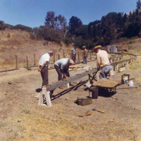 Golden Gate Live Steamers, Tilden Park. Henry Steimle supervising. Henry Pass and John Sweet doing all the work. September 1972. Photo by John Haines. From http://web.archive.org/web/20040718195946/http://www.ggls.org/pictures/EarlyDays/Tilden03.html