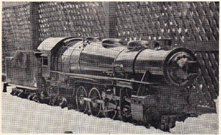3/4 inch scale 4-8-4 built by Gordon Corwin of Highland, California. Overall weight with tender is 315 pounds, with two cylinder steam feedwater pump. Walsheart Valve Gear and steam operated cylinder cocks. From Railroad Model Craftsman, Ocotber 1949.