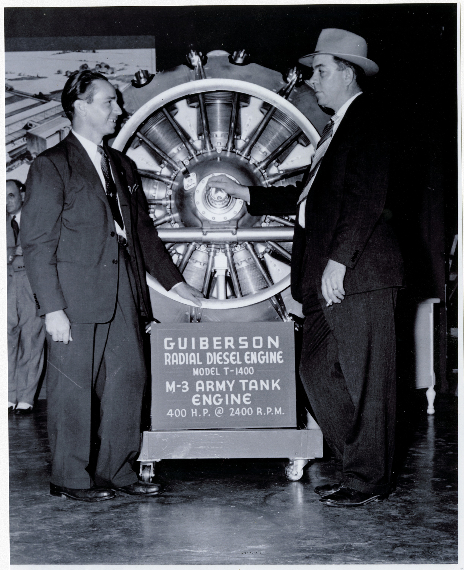 View of Guiberson T-1400 tank engine on stand, Dallas, Texas, 1941. Fred A. Thaheld (left) and Samuel Allen Guiberson, III (right) are posed along side. From https://airandspace.si.edu/collection-objects/propulsion-engines-guiberson-diesel-general-thaheld-fred-photograph
