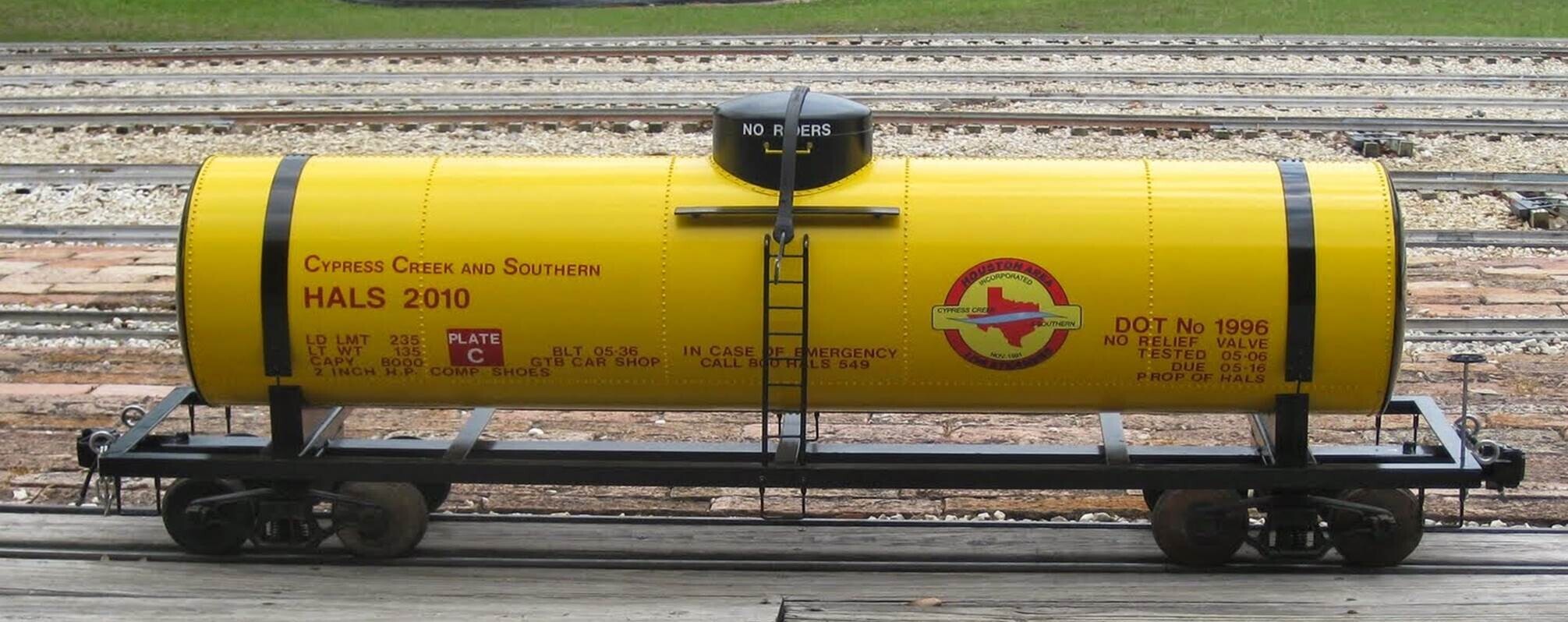 Tank car at Houston Area Live Steamers, 7 July 2021. Photo by Greg Moore.