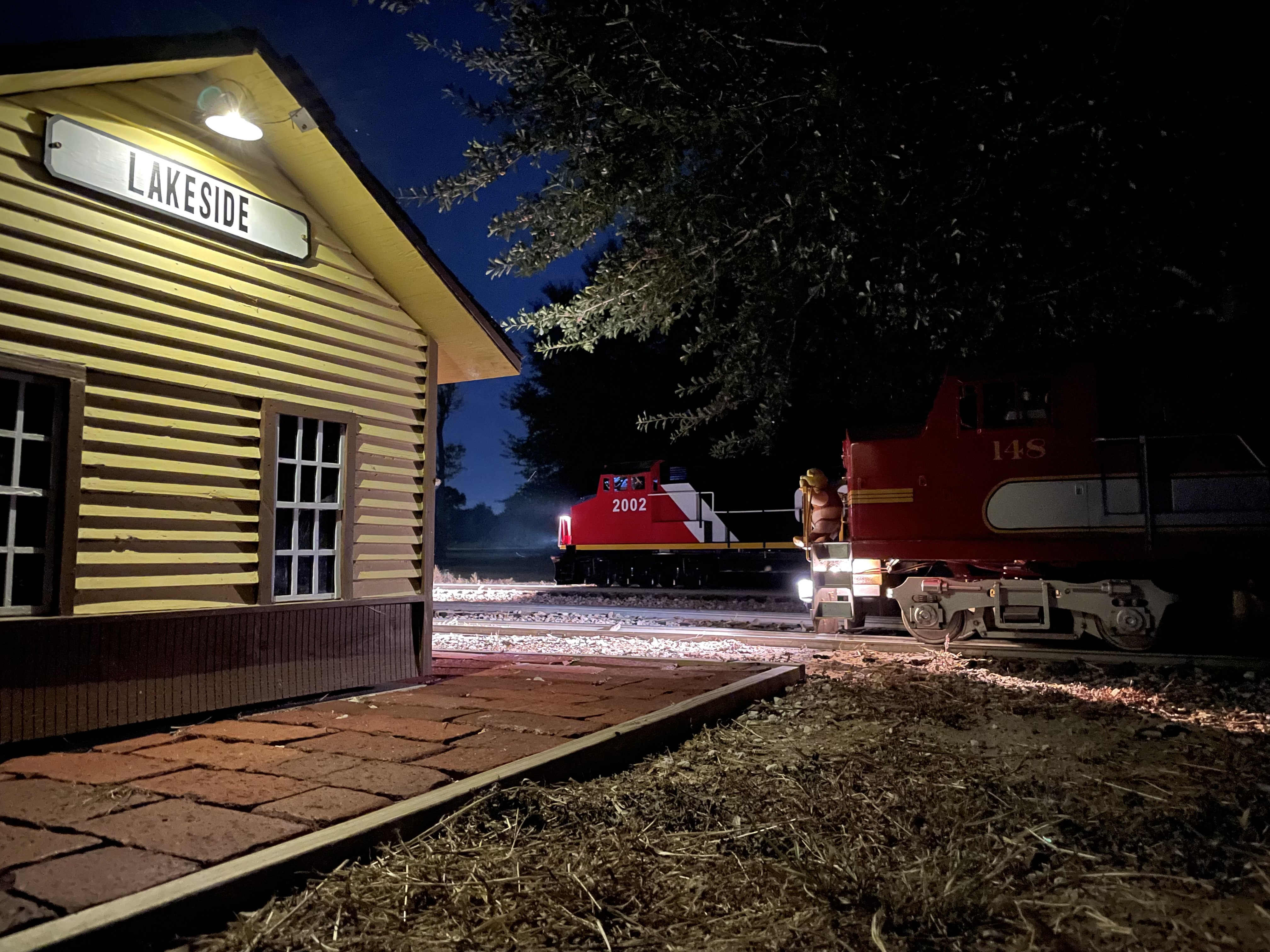 Nighttime run at Houston Area Live Steamers, photo by James Cash, 2023-08-17.