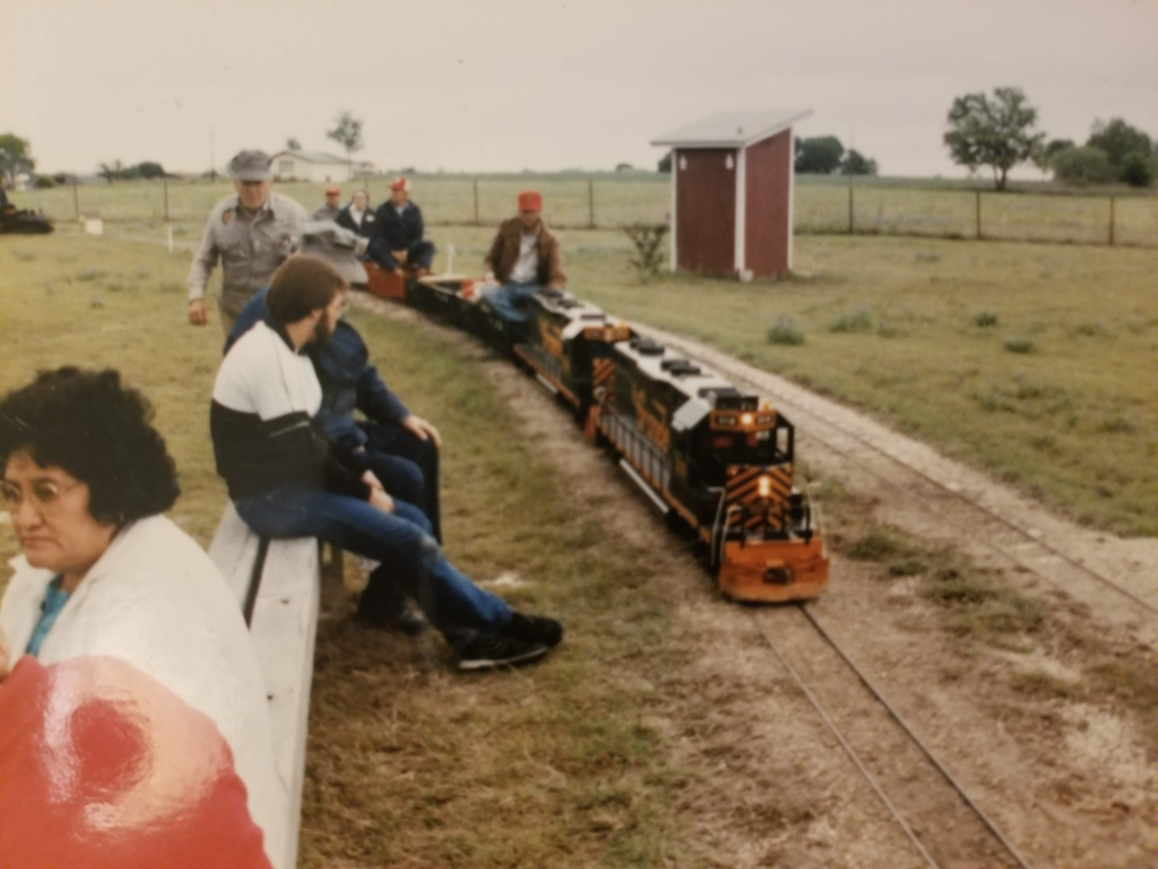 David Hannah III's Rio Grande motive power at the Austin & Texas Central Railroad in Manor, Texas. Date unknown, engineer and rider unknown. Kenney Rhodes Jr, used with permission.