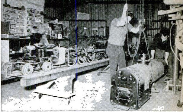 Bob Harpur's shop is one of the most complete locomotive works in the world. Worker is lifting boiler for 3-inch scale Hudson shown behind him. From "Popular Mechanics", August 1965.