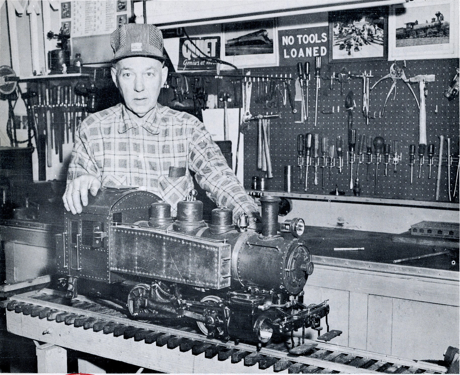 The accomplishment of a lifelong dream for Henry E. Kuehn is this 1 inch Switch Engine, 0-4-0. It will haul 2,000 pounds and is coal fired. The steam pressure is 150 pounds. It took 18 months for Henry to build this little beauty. From The North American Live Steamer, Volume 1 Number 12, 1957.