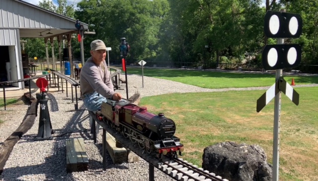 Henry Hosper's 1 inch scale Royal Scot with Steve Bratina at the throttle on his home track, July 2020. Photo provided by Steve Bratina.