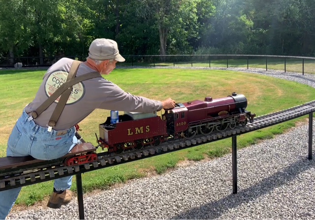 Henry Hosper's 1 inch scale Royal Scot with Steve Bratina at the throttle on his home track, July 2020. Photo provided by Steve Bratina.