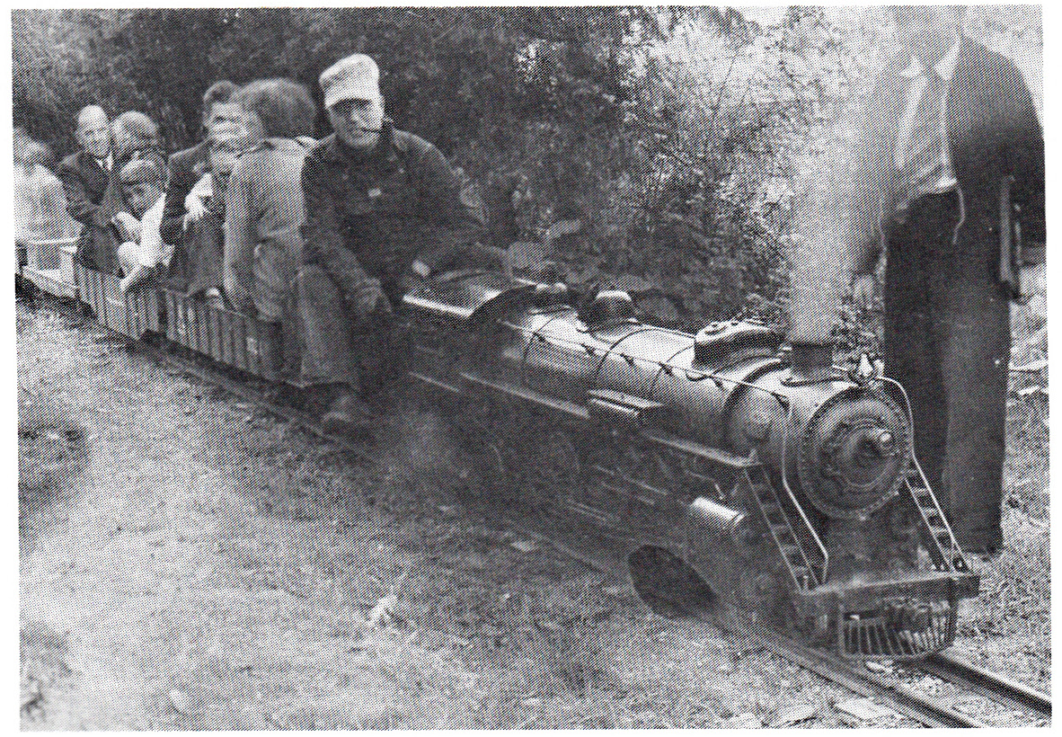 Horace Shaw at the throttle on the Whysall Light Railroad during an open house in 1938, Bloomfield Hills, Michigan. The young man standing behind the front of the locomotive is Hugh Pettis, son of Cliff Pettis. Photo by Cliff Pettis. From Live Steam Magazine, March 1979.