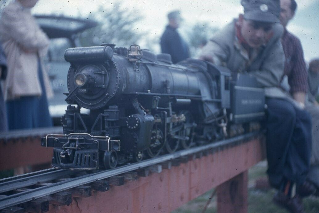 A three-quarter inch scale Hudson No 3500 on high-line with unknown engineer, unknown location. From eBay.com. Seller stated the slide was from the 1950s.