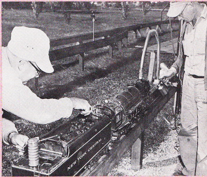 In the steaming bay, Hurst stokes firebox and Trook lubricates main steam cylinder. Booster, connected to stack, creates a draft. From "Magic Circle". Photo by Don Beeson.