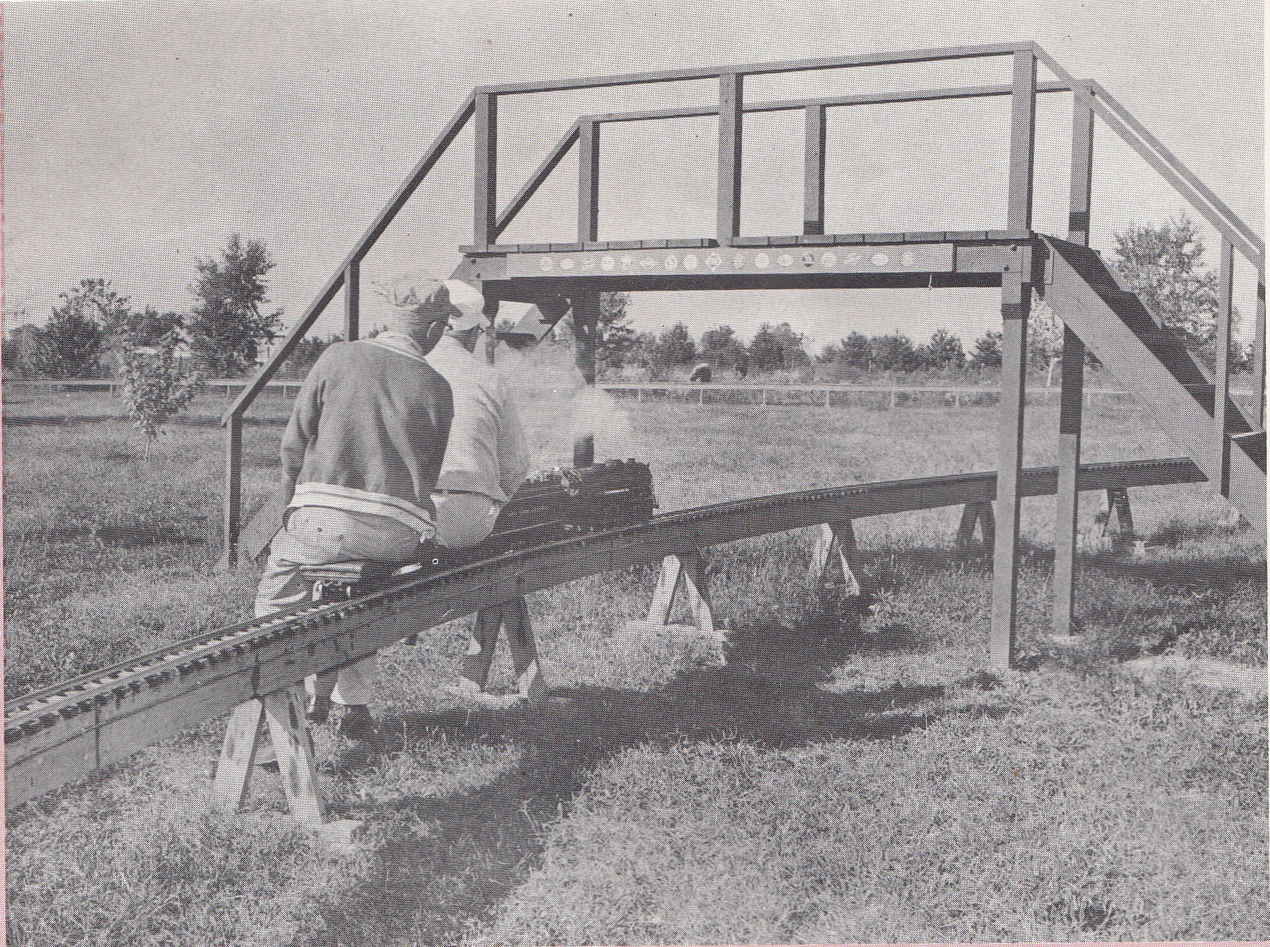 The 4-6-4 Hudson-type locomotive, built to an exact scale of 3/4 inch to one foot, hauls two adults over elevated track with ease. From "Magic Circle". Photo by Don Beeson.