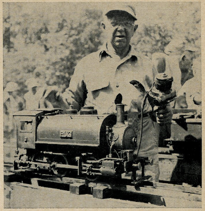 John Matthews with his "Pug". BLS meet at Toronto Society of Model Engineers, 1953. From "The Miniature Locomotive", November-December 1953.