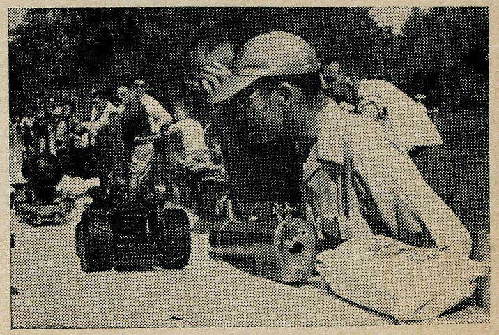 Titus of Mattoon looks over the traction engines. Bag of Welsh coal is seen in foreground. BLS meet at Toronto Society of Model Engineers, 1953. From "The Miniature Locomotive", November-December 1953.