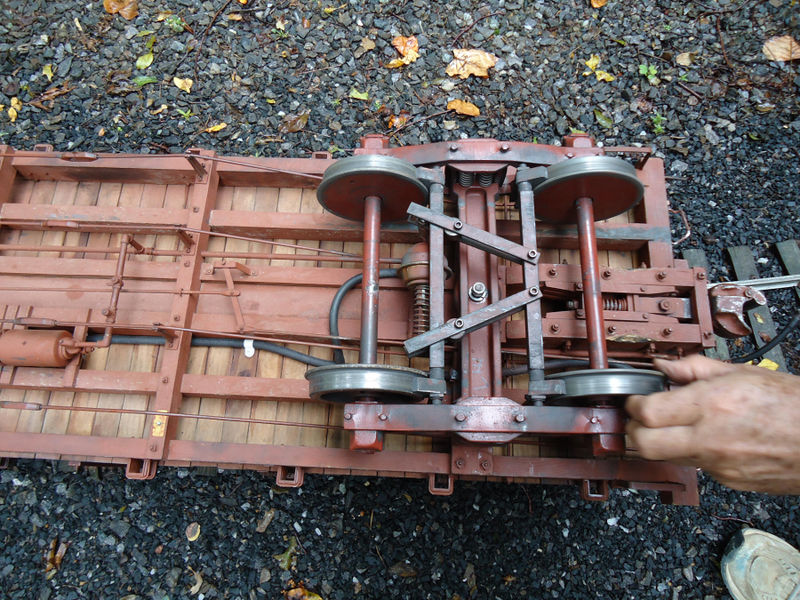 Four beautiful 7.5" ga. Jackson built truss rod cars. Very highly detailed with two cars having brakes. Two of the cars are flat cars and two are gondolas. Photo by Boehmke, 2017, from DiscoverLiveSteam.com.