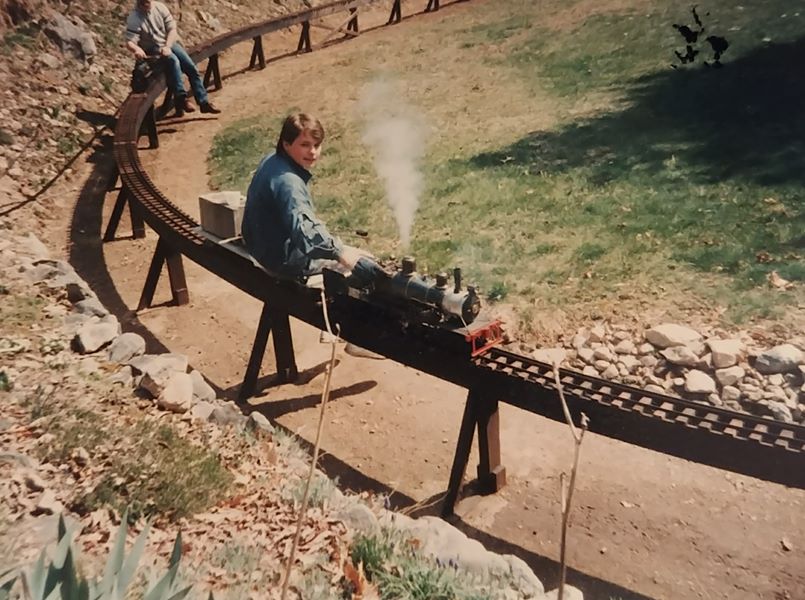 John Kurdzionak in 1987 running a 1 inch scale Hiraoka Climax built for 3-1/2 inch gauge track at Charles S. Purinton's highline. Photo by John Kurdzionak, from Facebook, 5 December 2019.
