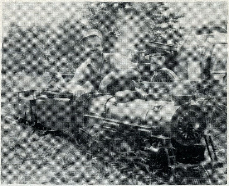 John Pugh of Grand Junction, Michigan with his 2-8-4 Berkshire. This engine has covered a good many fairs and rodeos around the state. Now, four years old, it still is an excellent steamer. From The North American Live Steamer, January 1956.