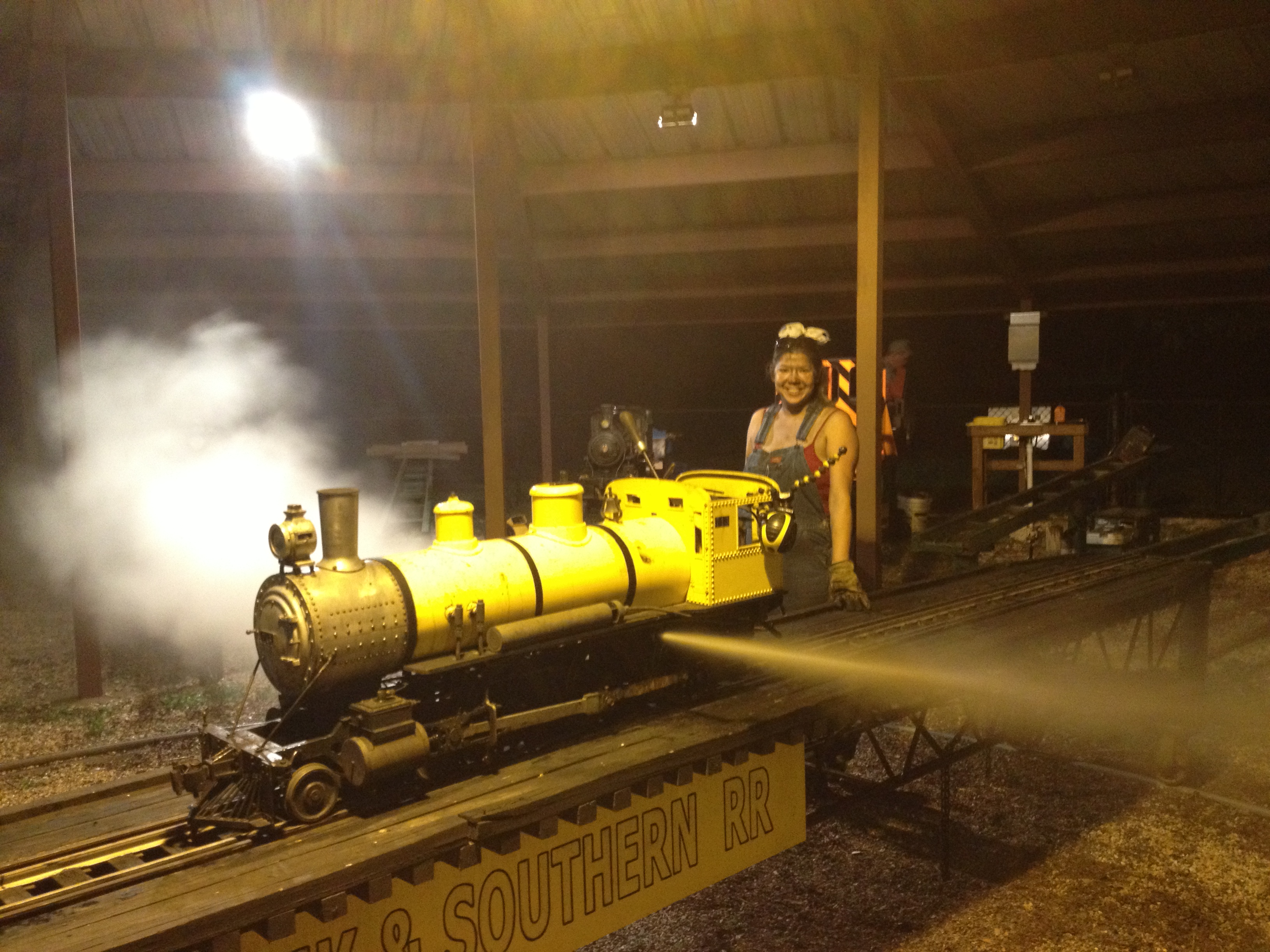 Kari Wirth at the engine shed of HALS, blowing down her Mogul. This locomotive belonged to her grandfather, Harry Simpson, and was blue when he ran it. It was built by Harold Christensen. Photo by Daris Nevil, May 2013.