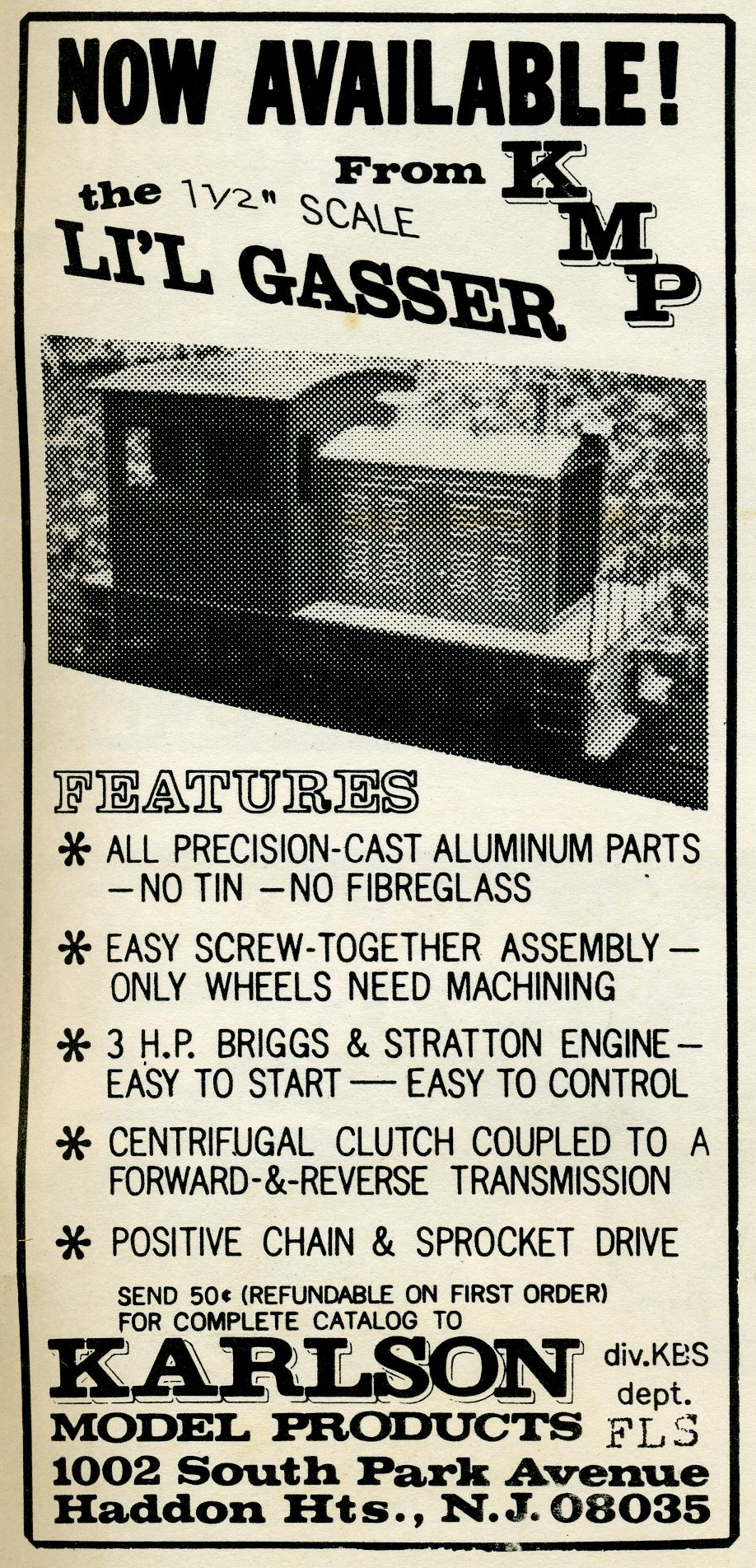 Karlson Model Products "Lil Gasser" advertisement from Floridan Live Steamers Yearbook 1975.