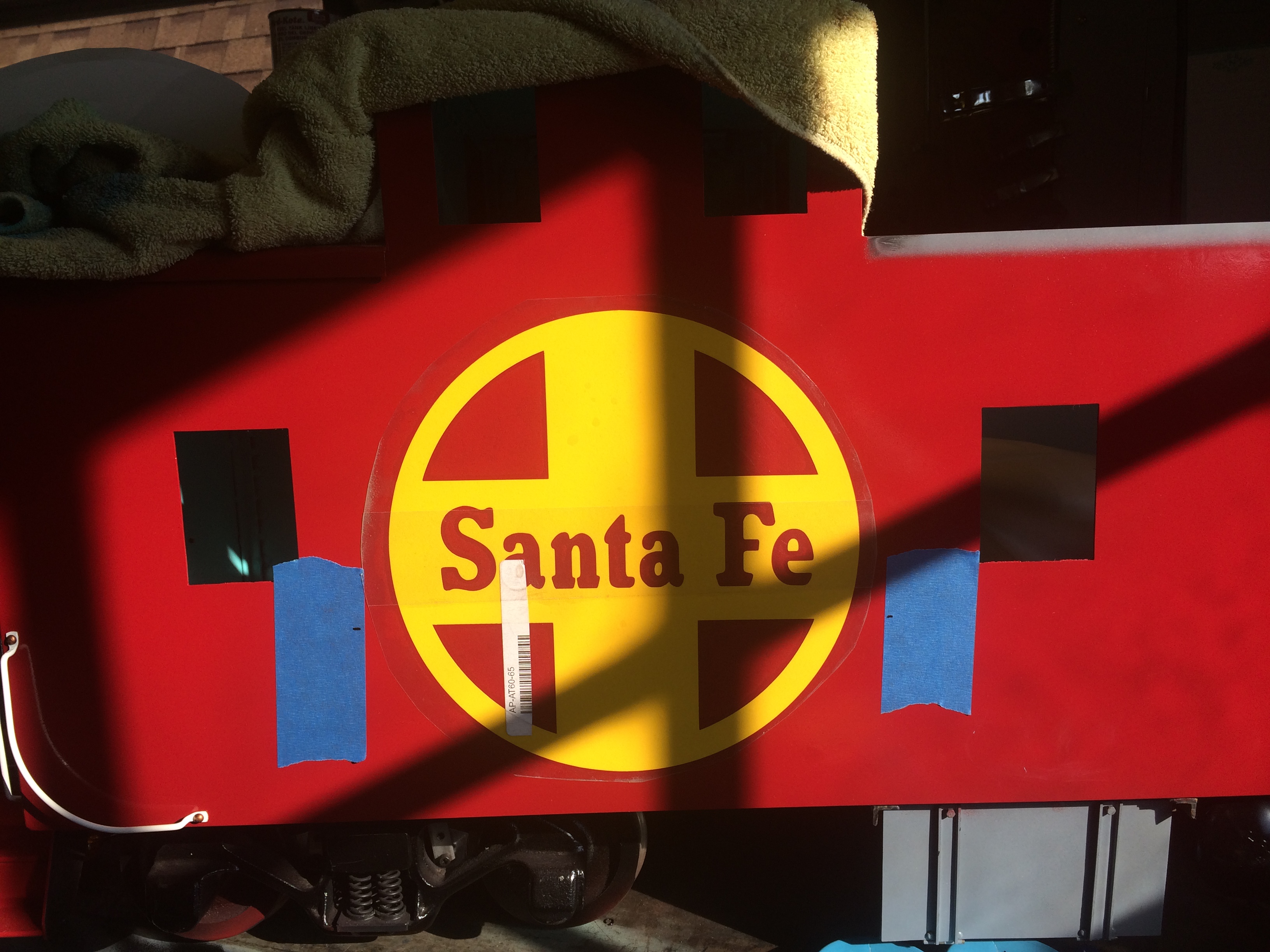 Two large 10 inch diameter "Santa Fe" logos were cut from yellow vinyl. Masking tape was applied adjacent to the location of the logo. Black marks were located on the tape by measuring from the bottom of the chassis. These marks were used as aids when applying the logo to keep it "level". The application tape has not yet been removed from the logo. Photo by Daris A Nevil, September 2015.