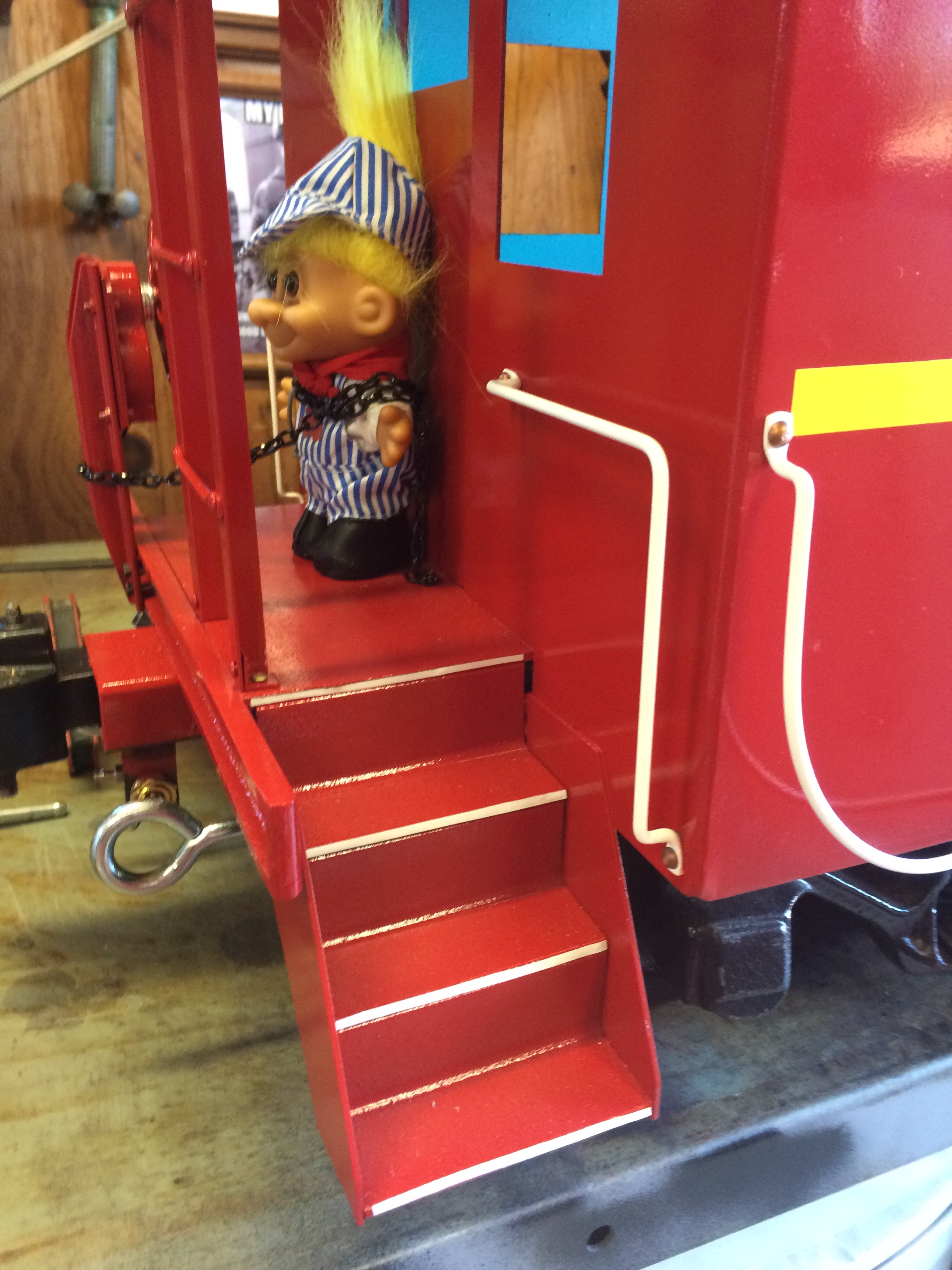 Narrow strips of white vinyl are applied to the top edge of each step for "safety". Photo by Daris A Nevil, October 2015.