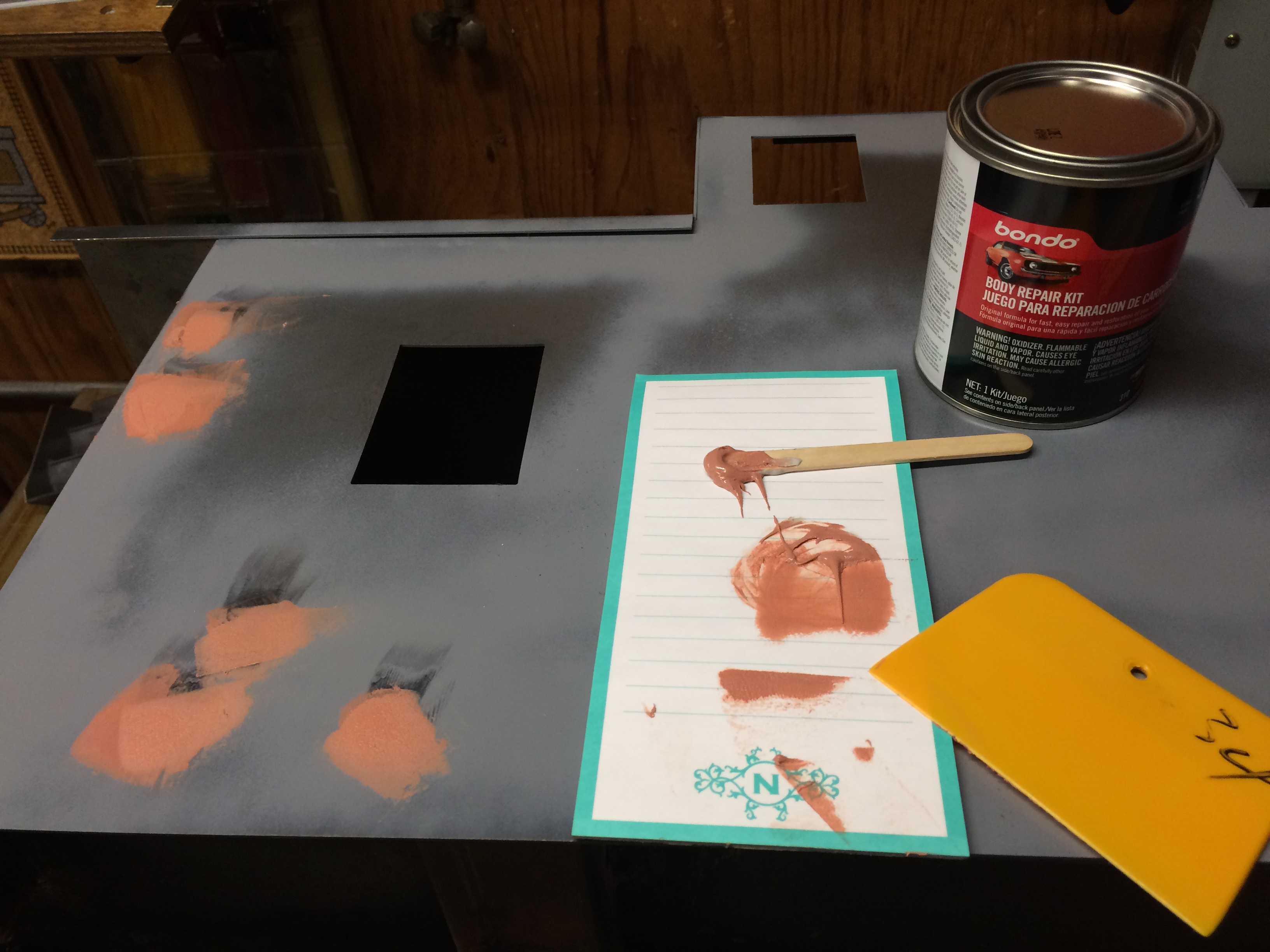 | 22:24, 17 June 2015 | 3,264 × 2,448 (1.27 MB) | Dnevil (talk | contribs) | The dimples have been filled with "Bondo". After setting the filled dimples will be sanded smooth. Photo by Daris A Nevil, May 2015. | ||